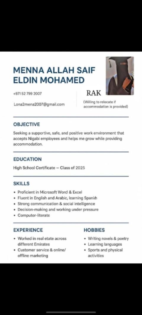 أنا انسانة سريعة التعلم وشغوفة بالعمل ابحث عن عمل أنا سودانية عمري 20 سنة مواليد عجمان وحاليا في رأس الخيمة ولا مانع لدي للانتقال اذا توفر سكن وإقامة أتحدث الانجليزية والعربية وأتعلم حاليا التركية والياباني وأسعى لتعلم لغات أخرى ملاحظة (أنا منتقبة)