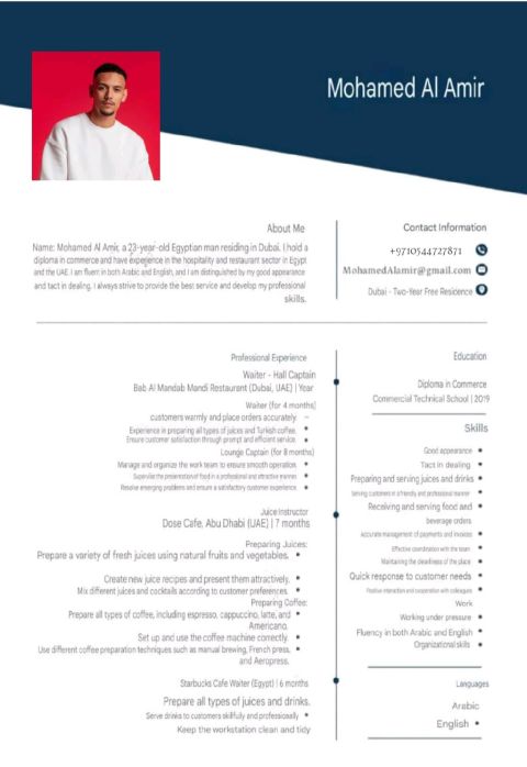 أنا شاب مصري الجنسية أحمل اقامة قابلة للإعارة عندى خبرة في مجال خدمة الزبائن واستقبالها وزيادة المبيعات أريد العمل داخل مراكز أو منتجعات طبية ولدى الخبرة 6 سنوات أيضا في مجال المقاهي والمطاعم داخل الدولة