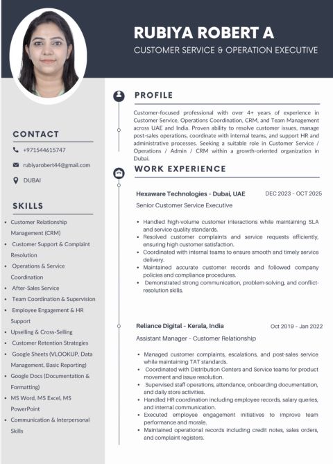 Customer Service & Operations Executive with 4 + years of experience in CRM, complaint handling, team coordination, and post - sales support. Skilled in customer satisfaction, operations management, and administrative support
