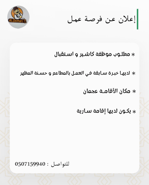 مطلوب موظفة كاشير واستقبال في مطعم ويكون لديها خبرة اسم المطعم ألد ومري في النعيمية 2 في عجمان