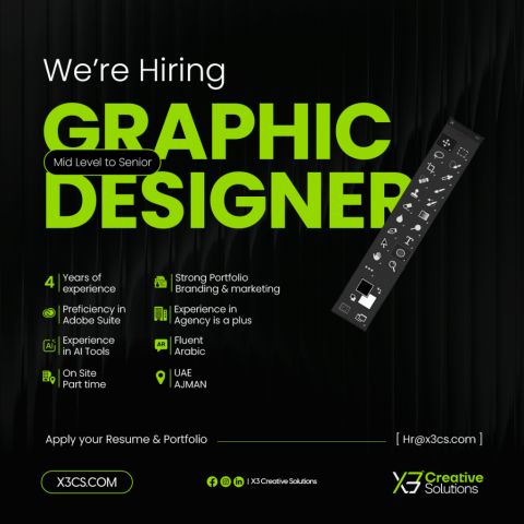 تعلن X3 Creative Solutions عن حاجتها الى مصمم جرافيك لديه خبرة قوية في التصميم، وفهم متميز لأساسيات العلامة التجارية، مع اتقان Adobe Photoshop وIllustrator. يشترط اجادة اللغتين العربية والانجليزية، والقدرة على تقديم تصاميم نظيفة ومتسقة، وتعد مهارات الموشن والأنيميشن ميزة اضافية. الموقع عجمان - أبراج هورايزون، مكتب 2107، الطابق 21، بلوك D الراشدية 1. التواصل عبر