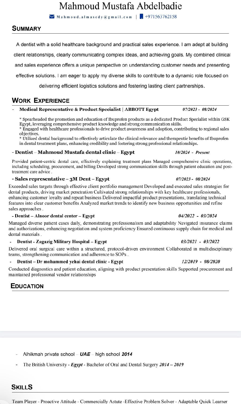 لدي اقامة سارية لمدة سنتان مع امكانية استخراج خطاب لا مانع فور. حاصل على بكاليريوس طب الأسنان. ابحث عن عمل في شركات التأمين أو مندوب لشركات الادوية أو أي وظيفة ادارية. وعلى وشك استخراج رخصة قيادة هذا الأسبوع