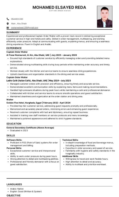 كابتن اوردر وايتر بخبرة أكثر من 4 سنوات في المطاعم والفنادق داخل الامارات ومصر، متمكن من خدمة العملاء، إدارة الطلبات، والعمل تحت ضغط. أجيد العربية والانجليزية. خبرة على أنظمة POS، ملتزم بالنظافة والجودة، وجاهز للعمل فورا