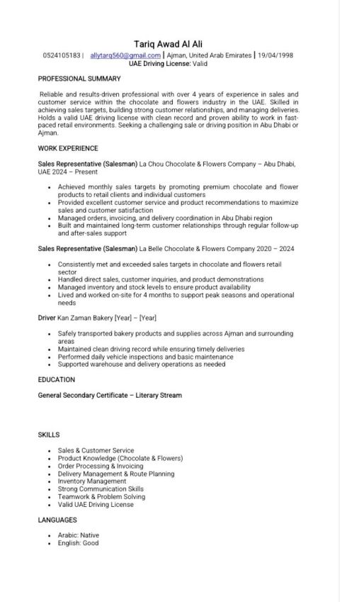 اسماعيل فوزي / مصري الجنسية / يوجد لدي اقامة اماراتية ورخصة سواقة مانول / خبرة أربع سنوات في الامارات عامين سائق في شركة مقاولات وعاملين سائق مع أسرة في الشارقة وخبرة 15 سنة داخل السعودية / وابحث على وظيفة سائق داخل شركة أو مع أسرة / رقم التواصل
