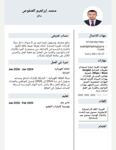 ابحث عن فرصة عمل سائق معي إقامة ورخصة قيادة اماراتية