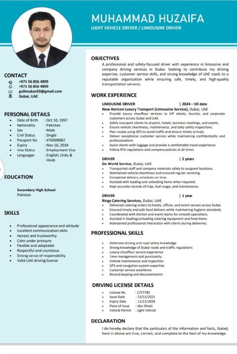 My name is Muhammad hasnain. I am from Pakistan. I have experience in Dubai 2 years 6 months. I need driver job for light vehicle