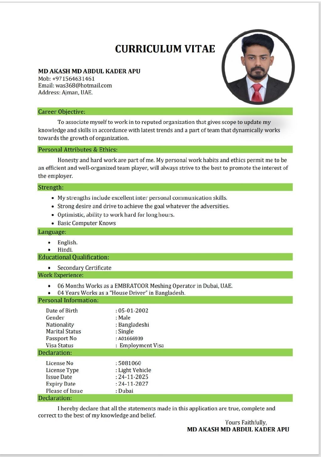 I have a UAE driving licenses. I got my licenses on this November 24 I am looking for a job. I have my own visa. before I have driving experience in Bangladesh many years and I also I have Bangladeshi driving licenses 2 years old. I can talk English and hindi. my education level is higher secondary school. so I am looking for a urget job if Anyone interest to hire me for driving job contact me