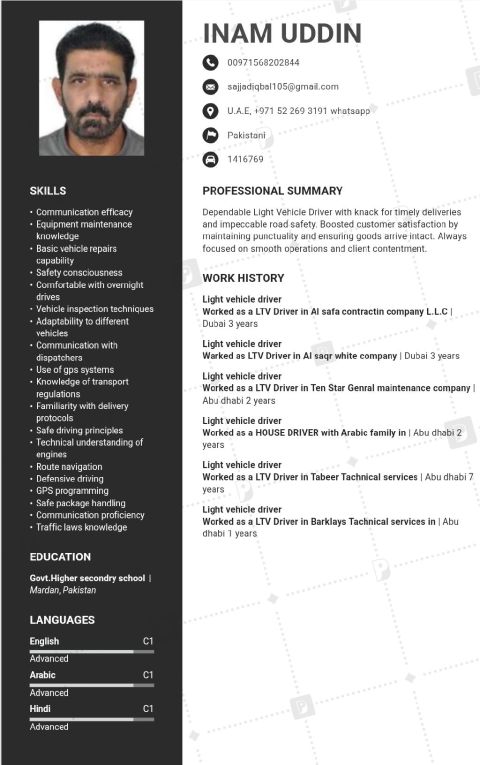 I am Irshad Khan Age 29 Years From Pakistan I am Looking For Light Vehicle Driving Job I have 8 Years UAE Driving Experience With Own Visa If Anyone Need Driver please call
