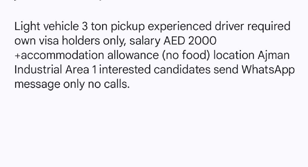 Light vehicle 3 ton pickup experienced driver required own visa holders only salary AED2000 + accommodation allowance (no food) location Ajman new Industrial Area 1 interested candidates send WhatsApp message only no calls