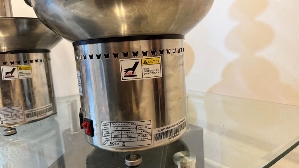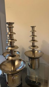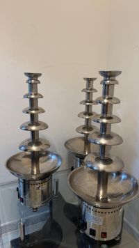 For sale A multi - layered chocolate fountain made of stainless steel, ideal for parties and events. It features a modern and durable design, with the ability to perfectly distribute liquid chocolate across its layers. The machine is easy to use and clean, adding a luxurious touch to any gathering or special occasion