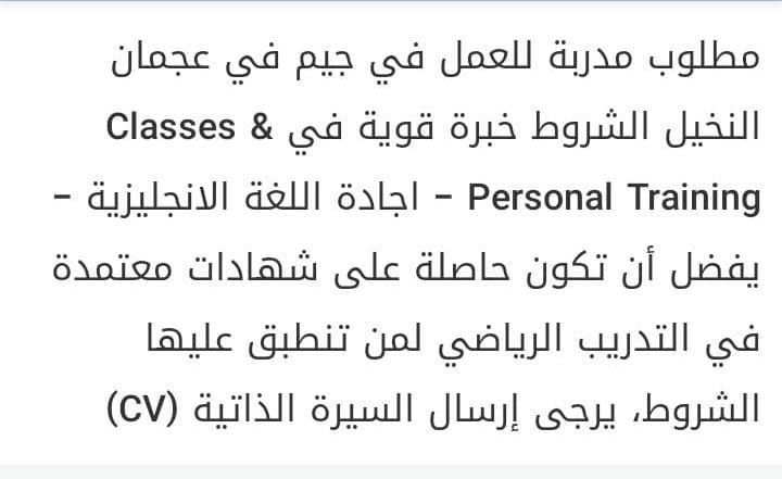 مطلوب مدربة للعمل في جيم في عجمان النخيل الشروط خبرة قوية في & Classes Personal Training - اجادة اللغة الانجليزية - يفضل أن تكون حاصلة على شهادات معتمدة في التدريب الرياضي لمن تنطبق عليها الشروط، يرجى إرسال السيرة الذاتية (CV)