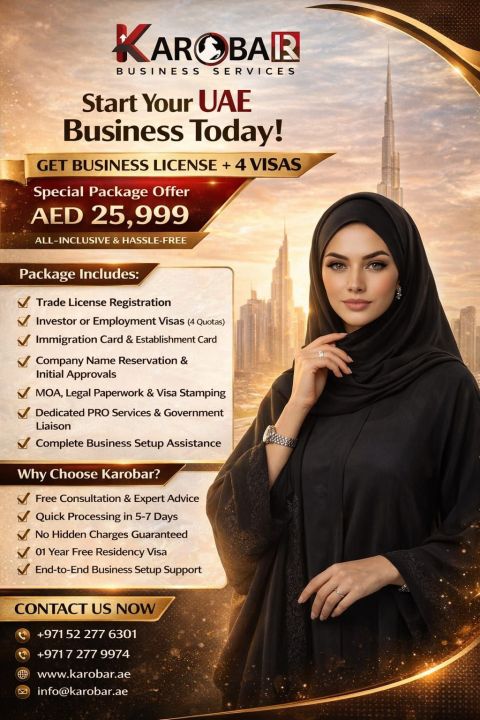 ابدأ عملك في الامارات مع كار وبار لخدمات الأعمال نقدم خدمات احترافية تشمل تأسيس شركات في البر الرئيسي - تأسيس شركات في المناطق الحرة - تأسيس شركات في راكز (RAKEZ) خدمات تخليص المعاملات الطباعة والترجمة - تأشيرات المستثمر والعمل والعائلة - التأمين الطبي وتأمين السيارات. خدمة سريعة وموثوقة واحترافية. اتصال
