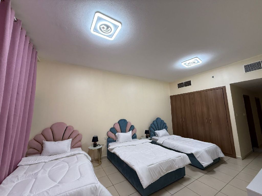 Two - bedroom apartment with a living room for sale in Ajman One Towers, one of the most prestigious towers in Ajman. The apartment features a large layout with 3 bathrooms, a laundry room, and a storage room. The size is 1750 SqFt. The unit is ready for immediate occupancy and is being sold fully furnished