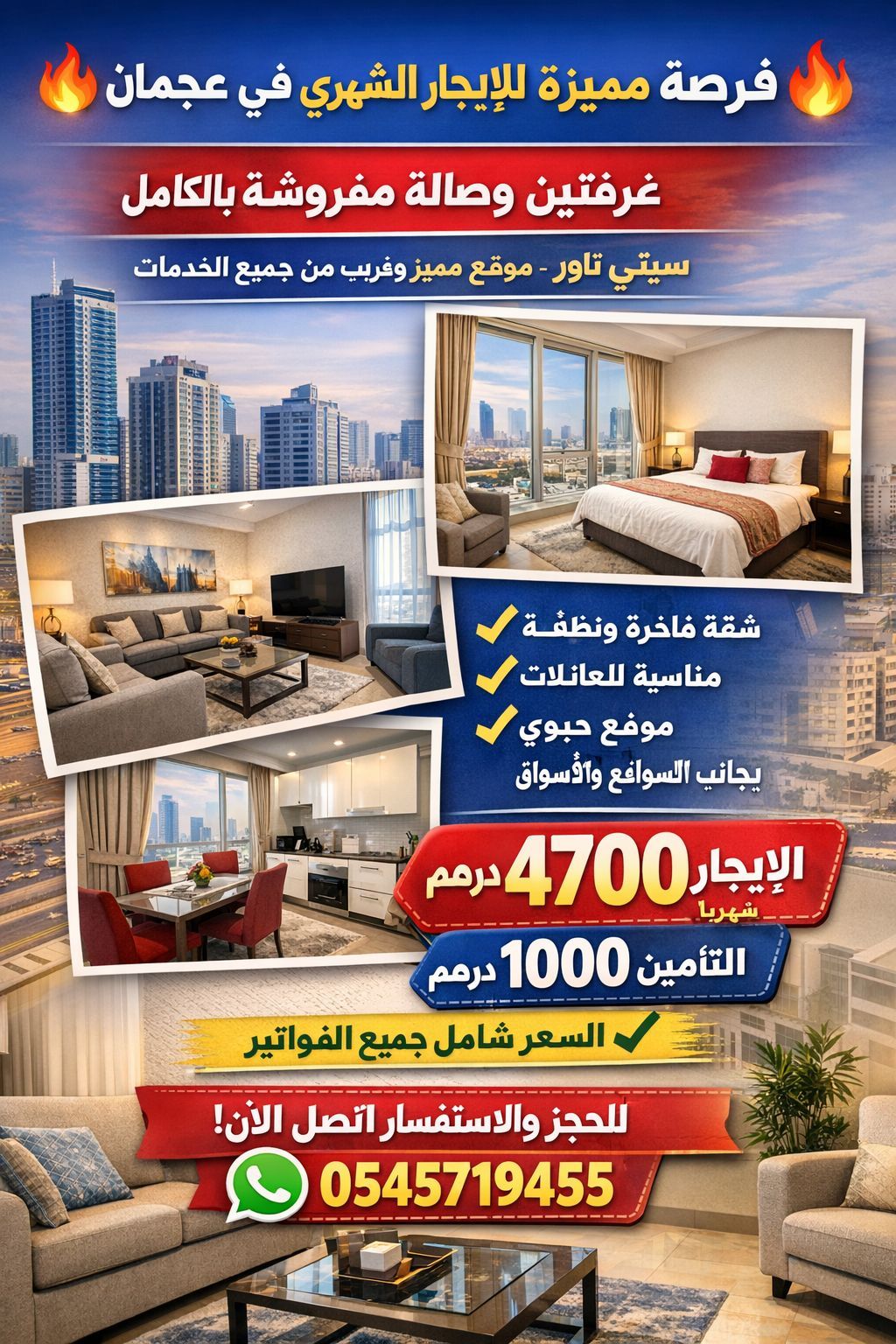 فرصة مميزة للإيجار الشهري في عجمان غرفتين وصالة مفروشة بالكامل سيتي تاور - موقع مميز قريب من جميع الخدمات شقة نظيفة ومجهزة بالكامل مناسبة للعائلات موقع حيوي وقريب من المطاعم والأسواق والمواصلات الإيجار 4700 درهم شهريا التأمين 1000 درهم فقط السعر شامل جميع الفواتير للحجز والاستفسار تواصل الآن