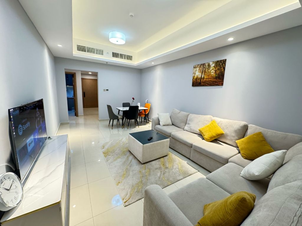 Ajman furnished apartment, one bedroom and a hall, Gulf Towers, Khalifa Street, 2 bathrooms with a balcony, price 5500 including bills and internet, with a gym, swimming pool, private parking, and a children'play area