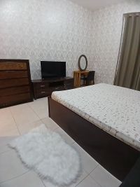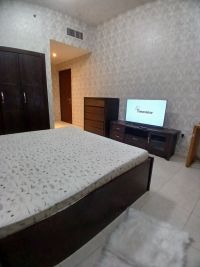First tenant, one room, hall, two bathrooms, kitchen, balcony, furnished, including electricity, water, sewage, internet, and parking inside the tower, open view, for monthly rent in Ajman, Corniche area