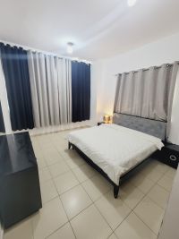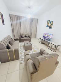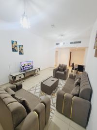 For monthly rent in Ajman - the most luxurious and elegant apartment, one bedroom and a hall with a balcony with an open view, fully furnished with high - end furniture, a fully equipped kitchen with the latest appliances, 2 bathrooms, a garden, and free private parking. Completely new construction with super deluxe finishes Location Ajman One Towers - Rashidiya 3 - near Ajman Corniche - next to