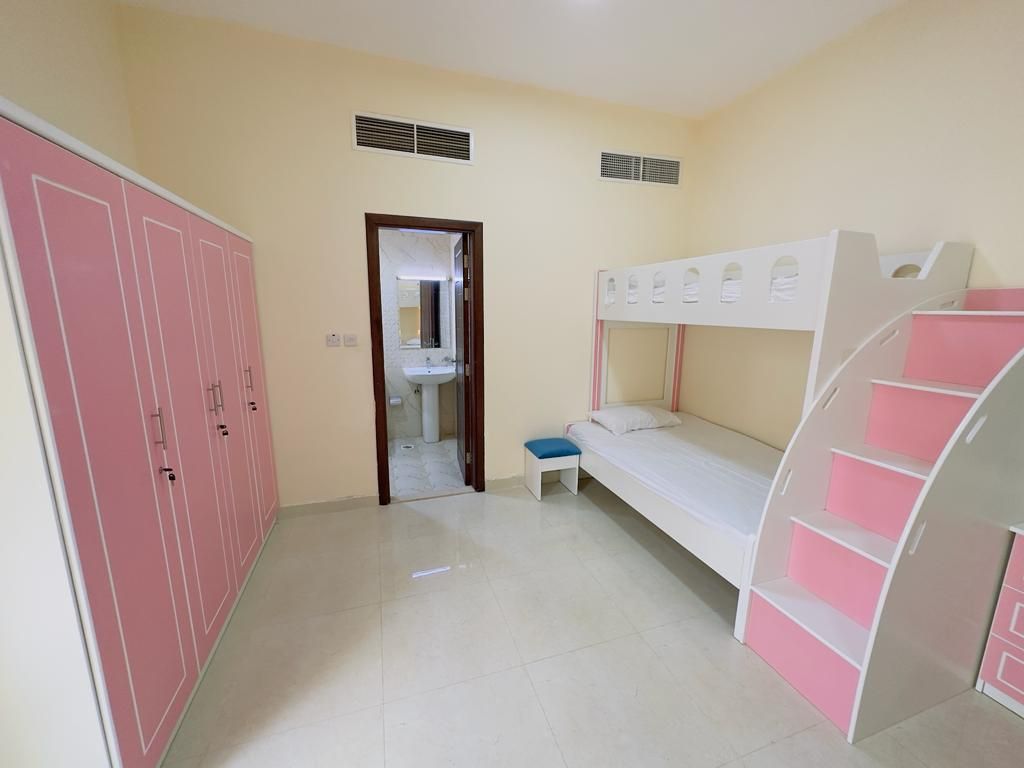 Two - bedroom apartment with a living room for rent in Rashidiya Ajman, in a prime location behind Etihad Center and close to Amina Hospital and Lulu Center. fully furnished with a large balcony, central air conditioning, and three bathrooms with spacious areas. Includes all utilities, internet, and maintenance for a comfortable living experience. Refundable security deposit upon move - out, with a