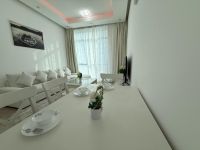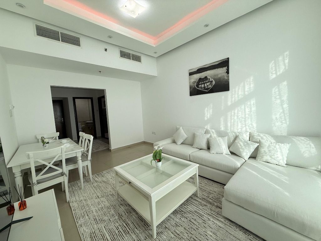 Furnished one - bedroom apartment for monthly rent in Ajman Corniche - Al Nakheel 2, Al Ittihad Tower. Prime location opposite Bahi Ajman Palace Hotel and Fairmont Hotel, with full sea views. The apartment is brand new, very clean furnishings, and features a spacious master bedroom, separate kitchen, large living room, and two bathrooms. monthly rent is AED5500 inclusive of electricity, water, internet