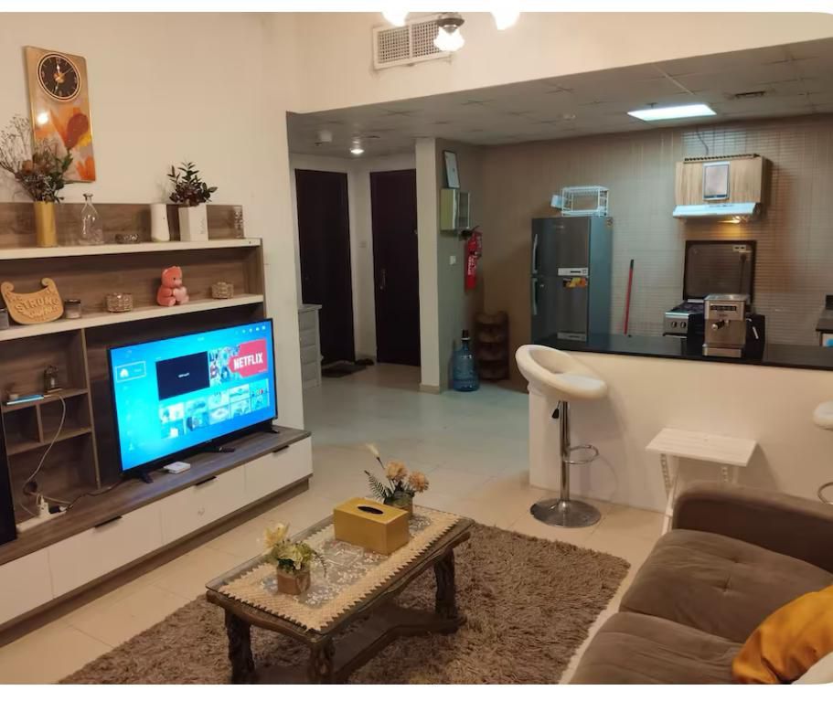 Furnished one - bedroom apartment with a living room for monthly rent in Ajman City Tower Towers in front of Grand Mall and Ladies'Park, next to Al Safeer Mall and the bus station. Includes all utilities, internet, and parking. rent 3800 Refundable security deposit upon exit 500