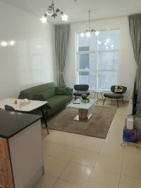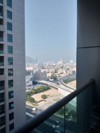 Fully furnished master bedroom and living room for monthly rent in Ajman, City Towers, close to all services and the bus station - 2 bathrooms - American kitchen - partial view of Grand Mall. Price AED3900 including bills