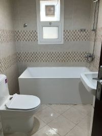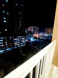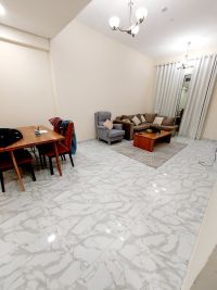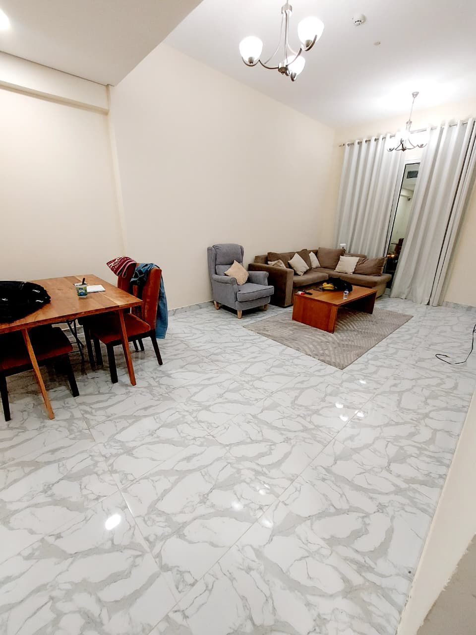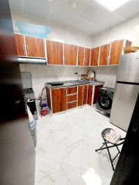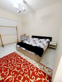 A furnished room and hall for rent in Rashidiya 3 with a large area, containing wall cupboards, two bathrooms, and a balcony with an open sea view opposite Ajman One Towers. The tower is new and there are earthen volcanoes below the tower. rent 4300 inclusive of all services, and insurance 500 is refundable upon checkout. Available from Bakra, booking is available, same photos and video