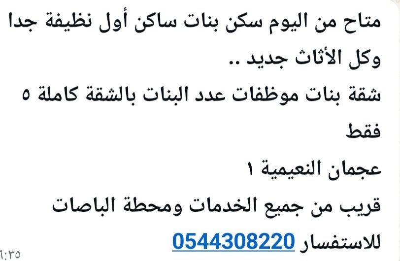 للإيجار سكن بنات مشترك أول ساكن نظيف جدا بنات فقط، عجمان النعيمية، شارع الاتحاد مقابل دي تو دي الجديد أمامه موقف باص عجمان ودبي