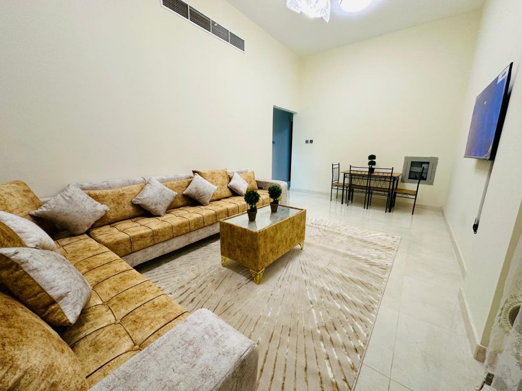 Two - bedroom apartment with living room for rent in Al Naeemia 2, Kuwait Street, Ajman. fully furnished with brand - new furniture, featuring 3 bathrooms, a balcony, and central air conditioning. Elegant design with spacious layout, ready to move in immediately. monthly rent is AED6000, including all utilities, internet, and maintenance, excluding gas. Refundable security deposit AED800. Contact