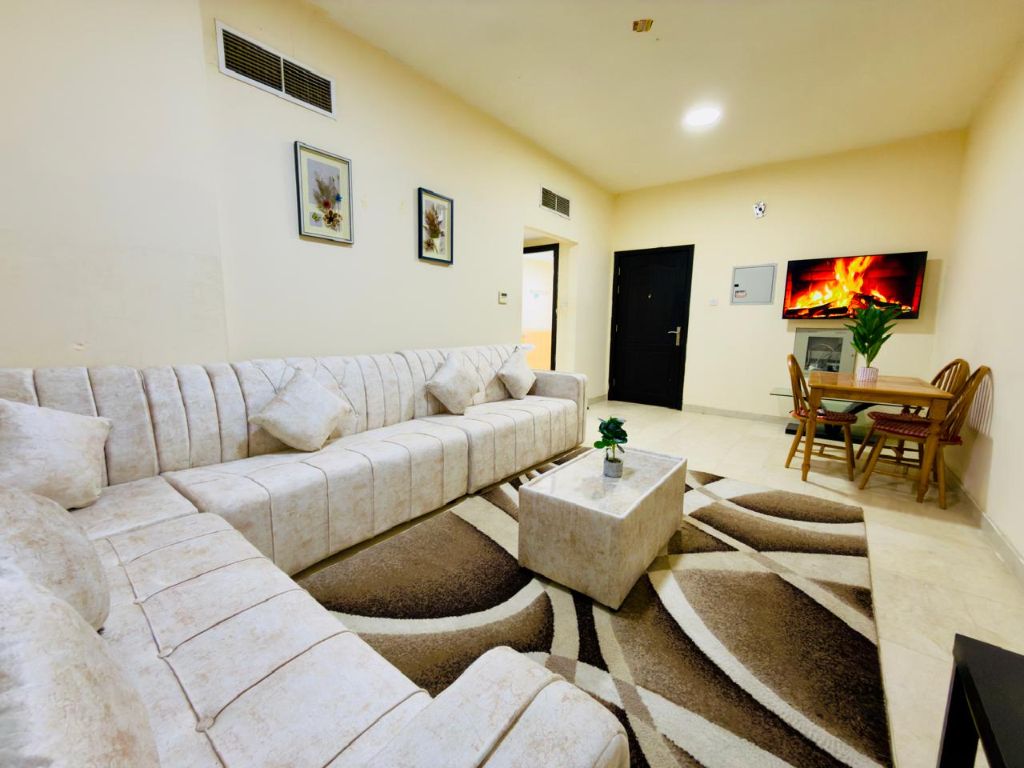 Fully furnished 1 - bedroom apartment with a living room for rent in Ajman, Al Rawdha 3, close to Al Hout, Hashem Hypermarket, and Al Qabael Discount Center. The apartment features new and clean furniture, 2 bathrooms, a balcony, and central AC. monthly rent AED4200, including all bills, internet, and maintenance, excluding gas. Contact