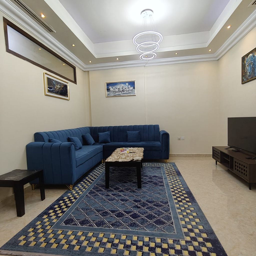 Furnished apartment for rent, three rooms and a hall in Al Rawda 3, new and clean furnishings, close to Bahar Al Emarat Restaurant, contains 3 bathrooms, prime location and easy access to Dubai and Sharjah, ready for immediate occupancy, rent 7500 dirhams per month including bills and internet