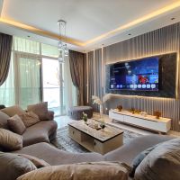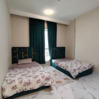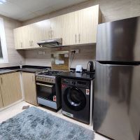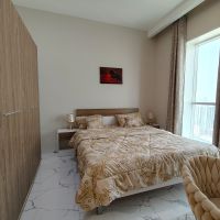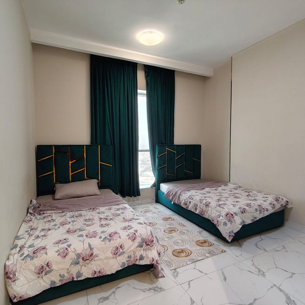 Furnished 3 - bedroom apartment with a living room and sea view in Al Waha Towers, Mina Street, Ajman All bedrooms are master suites, 4 bathrooms, storage room, 2 balconies Includes utility bills, internet, gym access, and a cafe Price AED12000 per month