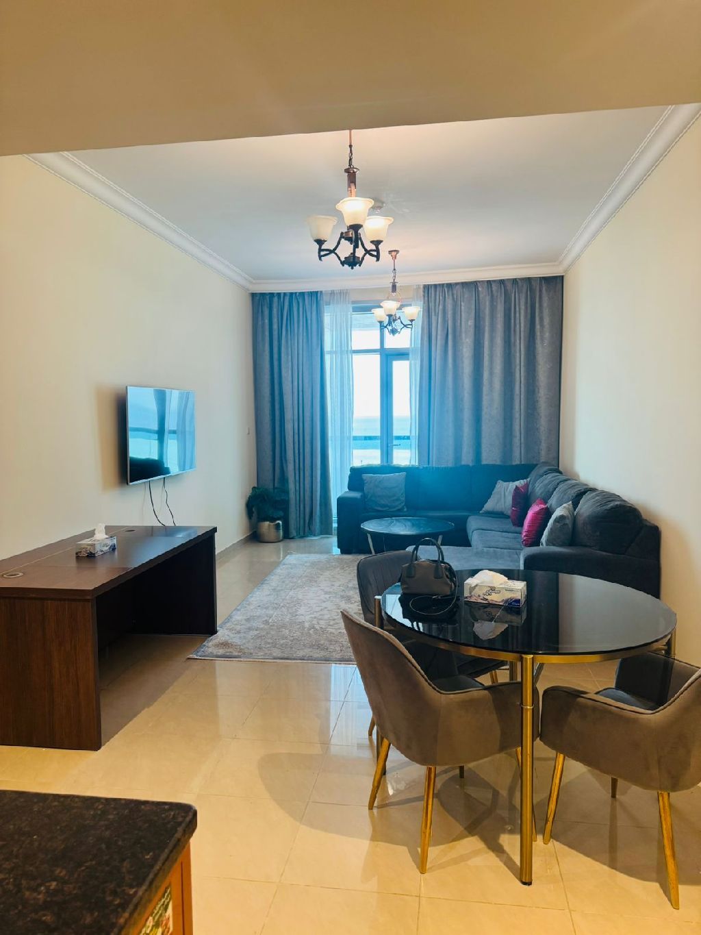 Furnished apartment with a sea view for monthly rent. It consists of a bedroom and a living room with a comfortable layout and high - end finishes, ideal for a peaceful stay on the Corniche, close to all services, restaurants, and the seaside promenade. monthly rent is AED8000, and a refundable security deposit of AED2000 is required upon departure. A unique opportunity to live with a direct sea