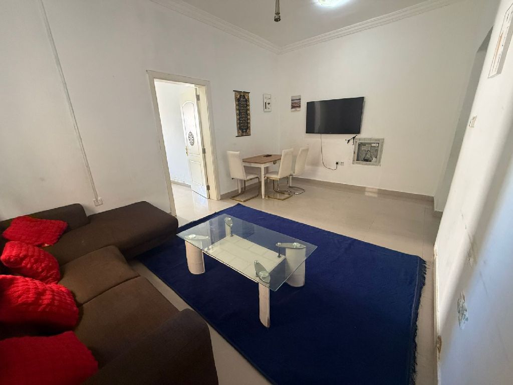 Furnished one - bedroom apartment with a living room and two bathrooms for rent at AED3500 per month, including bills, internet, and everything else, with free parking. Second row from Ajman Corniche