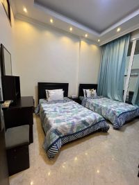 For monthly rent in Ajman, Al Rawda area fully furnished three - bedroom apartment with a living room. The apartment features clean and tidy furniture, exuding luxury and sophistication. It boasts a spacious layout, central air conditioning, a separate kitchen, and three bathrooms. The building is very clean and located behind Bahar Al Emarat Restaurant, directly on Khalifa Street. The area is ve