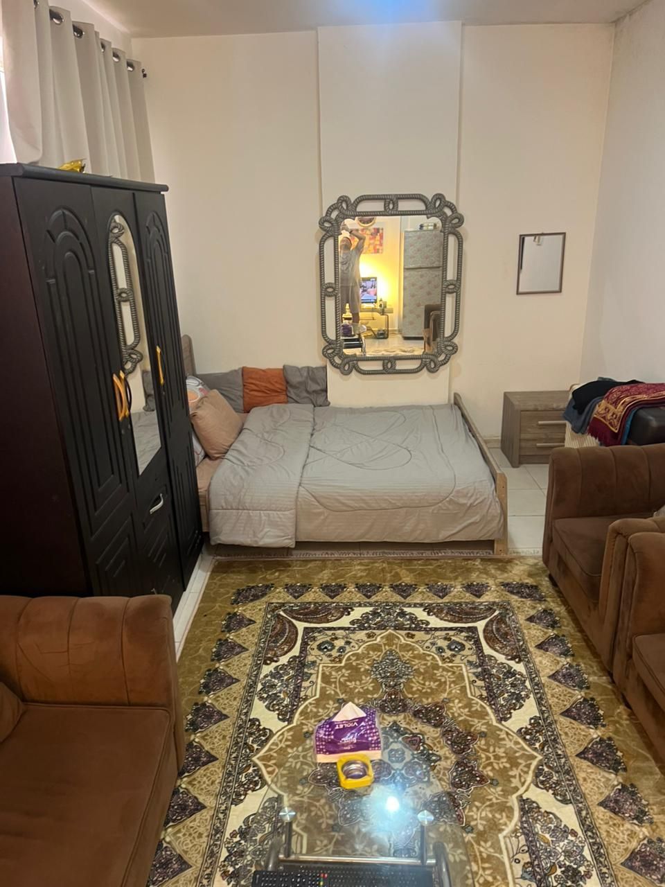 Studio available for monthly rent, fully furnished with clean furniture, including all bills. Located in a family building in a lively area in Rashidiya 3, next to Grand Mall and close to all services