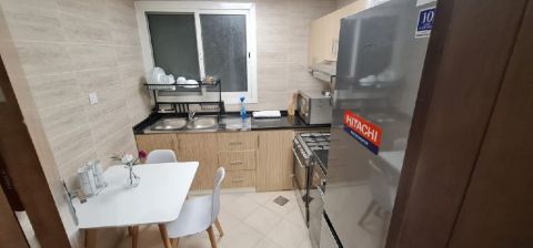 Furnished apartment for monthly rent, one room, a lounge, 2 bathrooms, and a balcony, Ajman, City Towers, opposite the Grand Mall and Al Safeer Mall. A very clean apartment, a large area, modern furniture, a kitchen equipped with all electrical appliances, central air conditioning, the price is 3200, including all bills and the Internet. Contact us