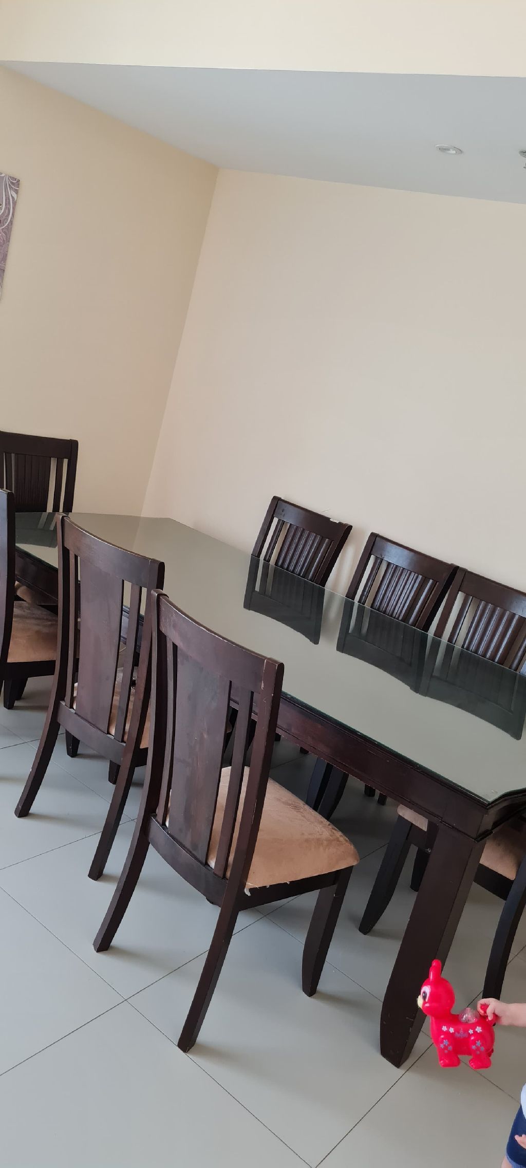 للبيع طاولة سفرة خشبية، مع لوح زجاجي علوي، 8 كراسي، بحالة جيدة للبيع بسعر رمزي 500 درهم