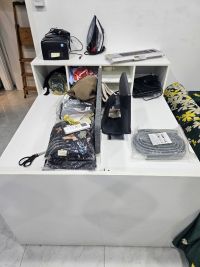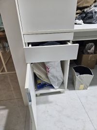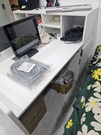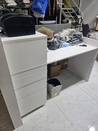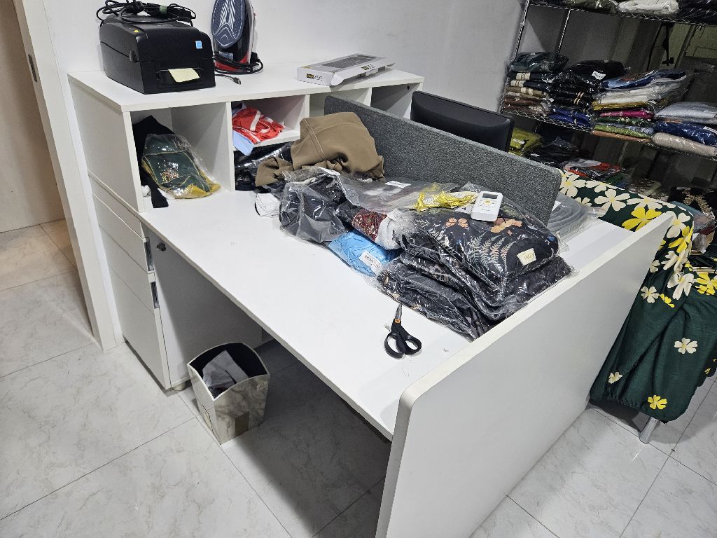 مكتب عمل لموظفين اثنين بينهم، قاطع غير مستعمل جديد مقاسات 145*120*85 خشب أبيض موجود ادراج وأماكن للحفظ ورفوف للعمل