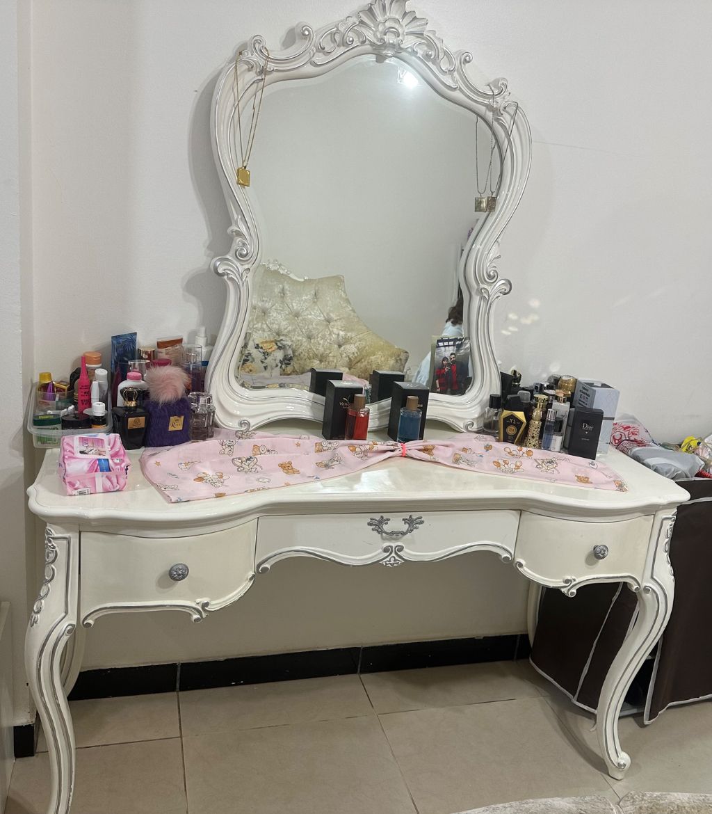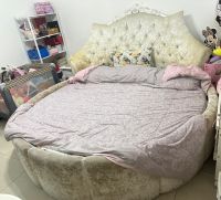 For sale a bedroom, a round bed, a large royal back and an internal box with mattres with 2 side tables, a dressing dresser with a mirror and a chair without a wardrobe in good condition located in Ajman