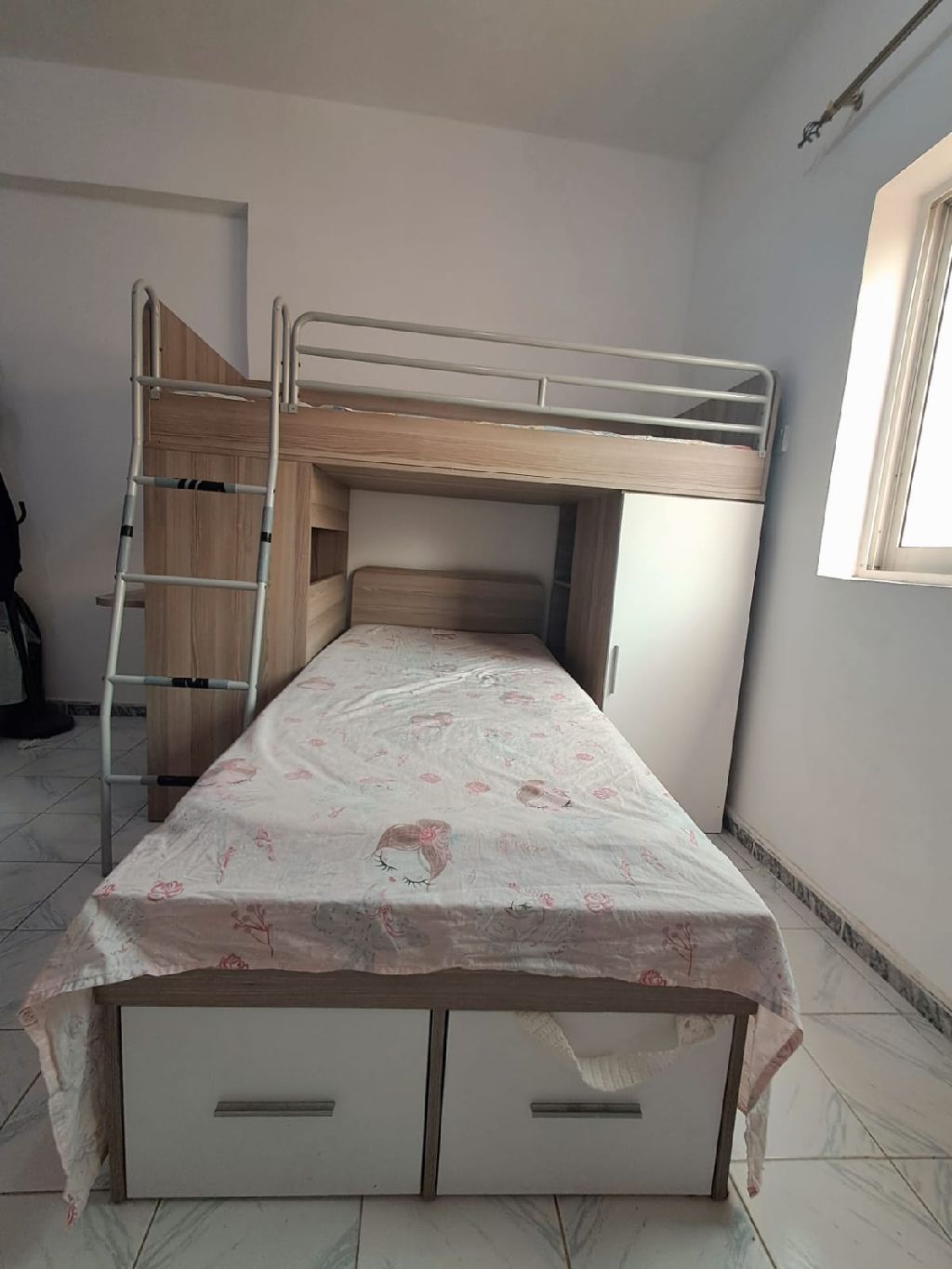 سرير اطفال دورين ممتاز مع مكتبة وخزانة وأدراج في السرير مع 2 فرشة نوعية خشب بجودة ممتازة. موجود في عجمان البيع لضيق المكان السعر 500 درهم