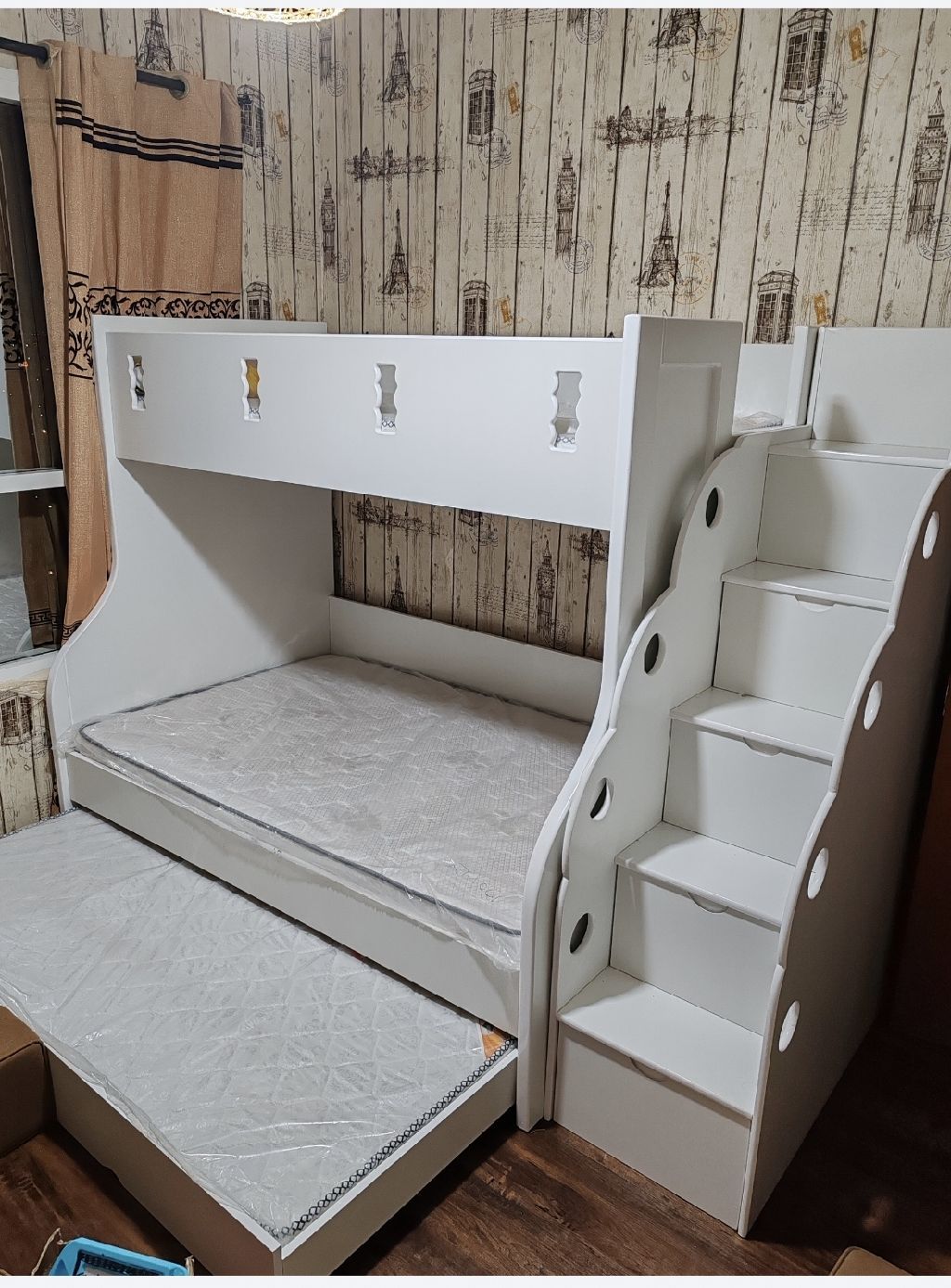 Children'bed for sale Local wood Two bunk beds 3 sleeping areas New Selling due to limited space only Location Ajman Price AED2500 Includes 3 mattresses Contact