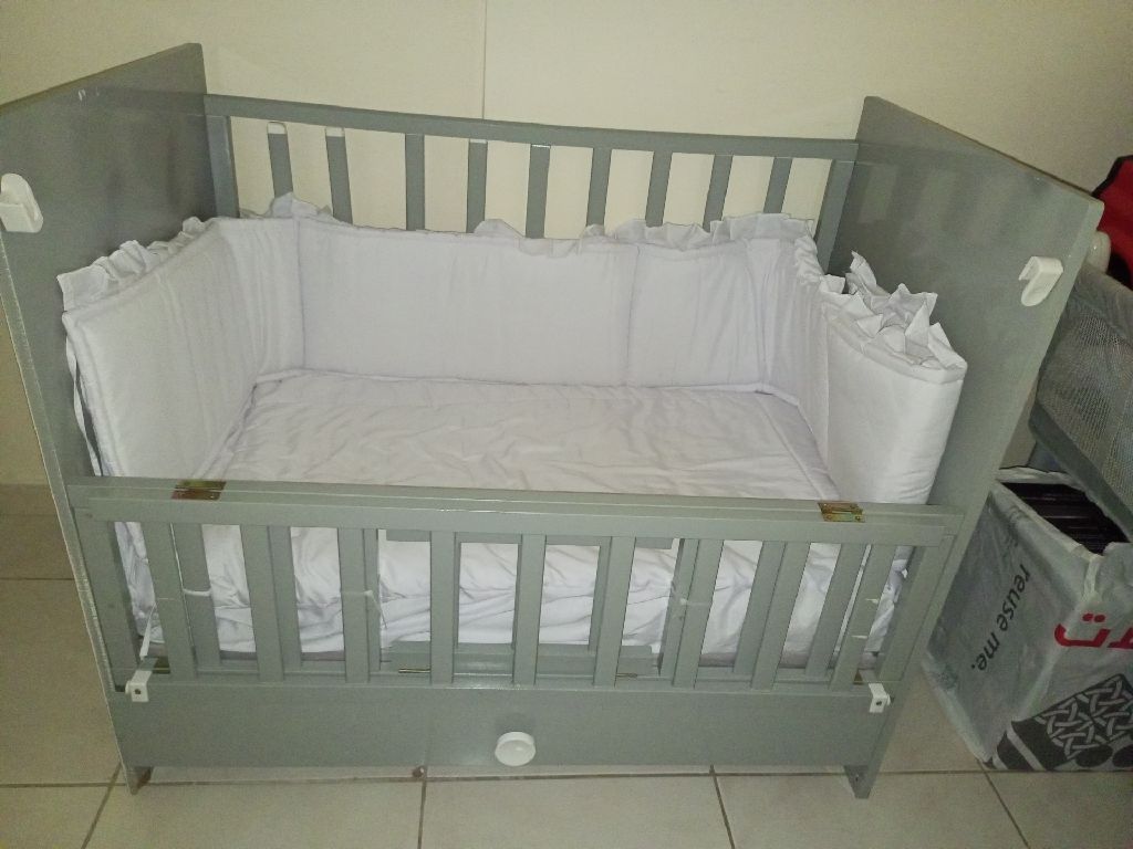 Iron baby bed in excellent condition Very light use Vibrating with levels for height + Wooden baby bed in good condition Opens on the mother's side It has a storage drawer with mattress + Arabic children in good condition. All prices are 270