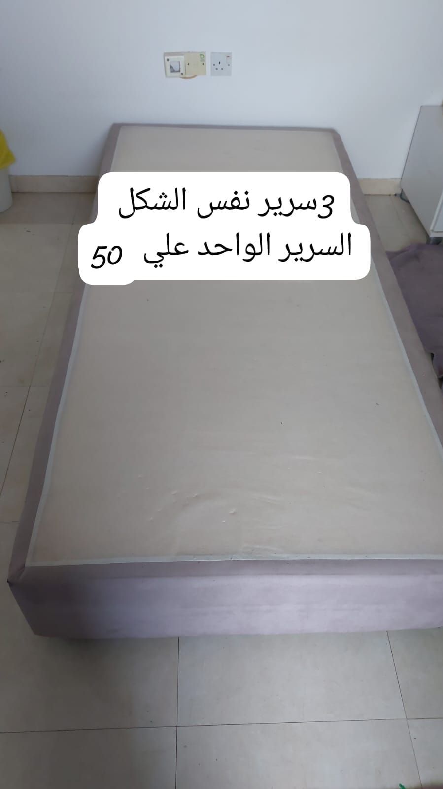 3 beds of the same shape. The price of one bed is 50 dirhams, and it comes with 2 bedside tables, 15 dirhams. There is negotiation