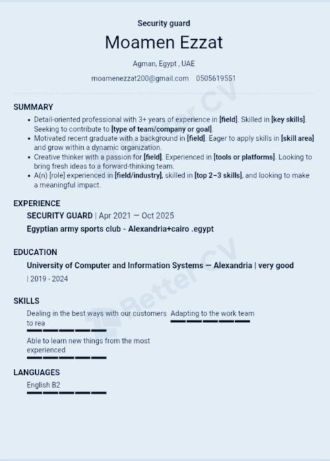 ابحث عن فرص عمل في مجال الأمن أتمتع بالجدية والالتزام وقدر علي التكيف مع بيئات العمل المختلفة ولدي استعداد كامل للتعلم والعمل تحت ضغط وجاهز للانضمام فورا السن 26 سنة