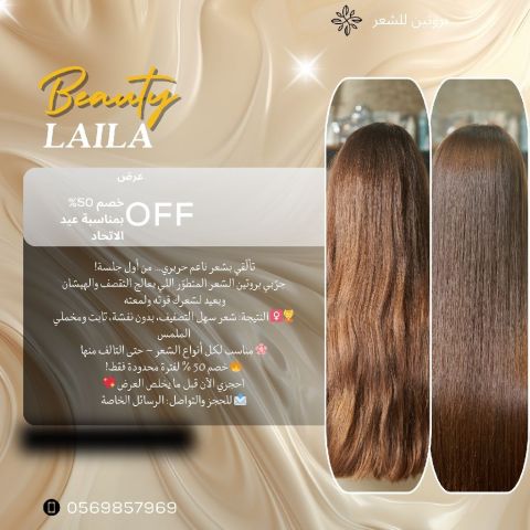 تألقي بشعر ناعم حر يري من أول جلسة جربي بروتين الشعر المتطور اللي يعالج التقصف والهيشان ويعيد لشعرك قوته ولمعته النتيجة شعر سهل التصفيف، بدون نفشه، ثابت ومخملي الملمس مناسب لكل أنواع الشعر - حتى التالف منها خصم 50% لفترة محدودة فقط احجزي الآن قبل ما يخلص العرض للحجز والتواصل الرسائل الخاصة