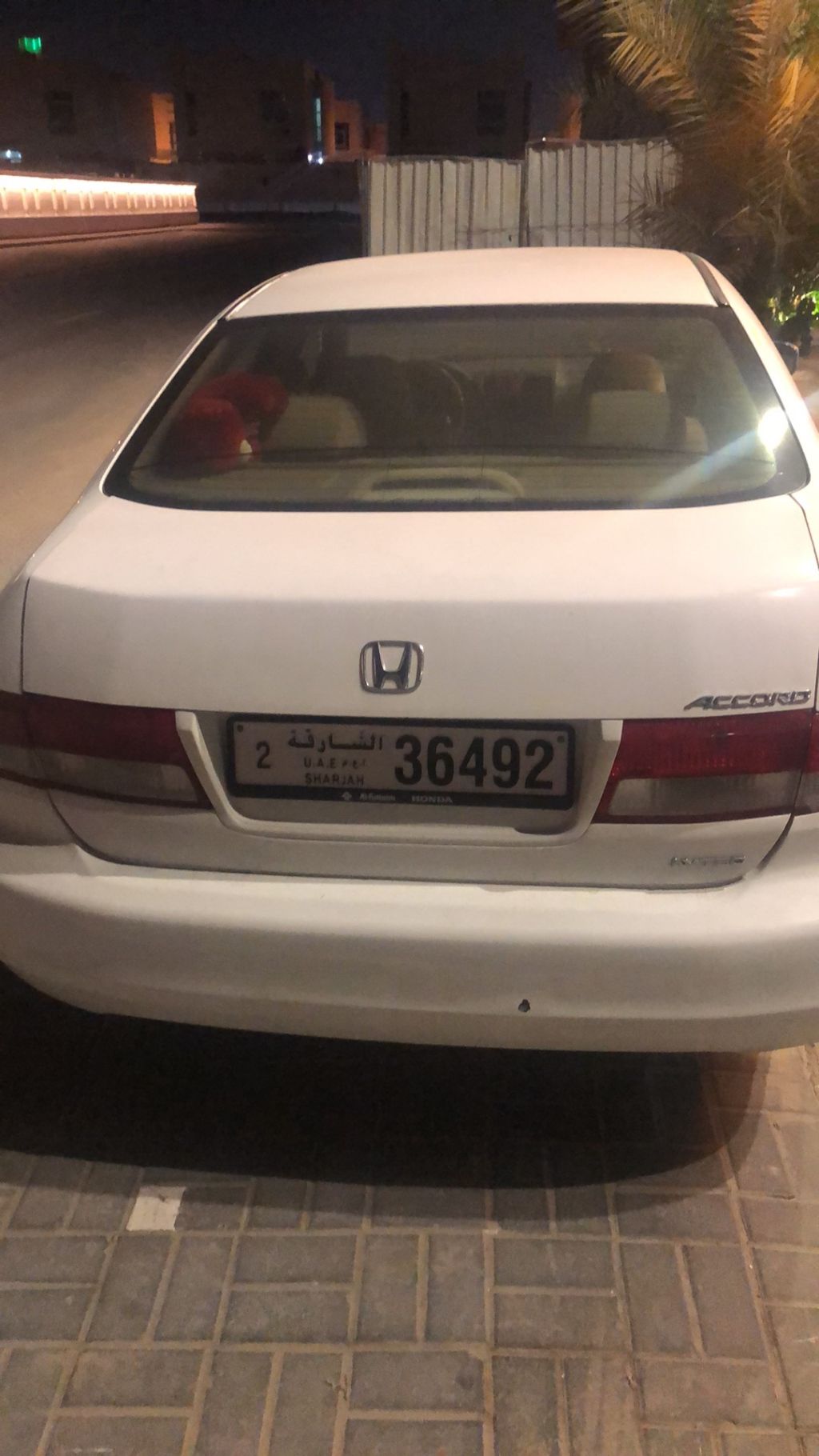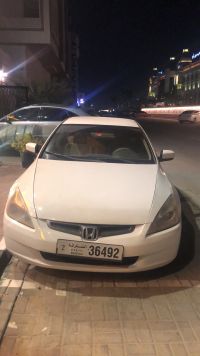 For sale: Honda Accord, white color, model 2004, one-year ownership. Selling due to travel. Price 6500 dirhams, Sharjah plates with 10 months ownership.