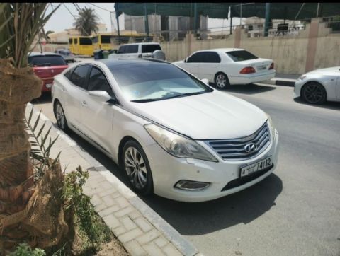 Hyundai 2014, GCC specifications, 6-cylinder, white exterior with beige interior. Features include panoramic sunroof, rear camera screen, electric massage seats, rear curtains. Engine has run approximately 200,000 km, no accidents, second owner. Asking price: 16,500 AED, negotiable after inspection. Contact for more information.