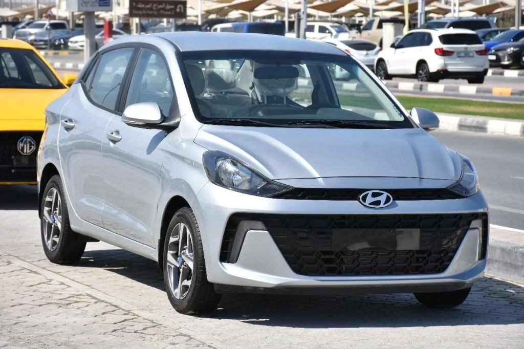 Hyundai Grand i10 V4, 1.2L engine, 2024 model. Price: 44,000 AED. Registration included within UAE. Odometer: 0 km. Specifications: GCC specs. Color: Silver. Interior: White/Gray. Engine: 4-cylinder, 1.2L capacity, 83 horsepower, 114 Nm torque. Transmission: Automatic 4 or 6 speeds depending on variant. Drive: Front-wheel drive (FWD). Top speed: approximately 155-160 km/h. Acceleration 0-100 km/h: between 14.5 and 15.4 seconds depending on source. Automatic (CVT/AT).