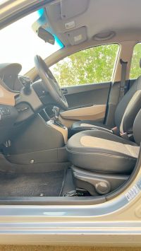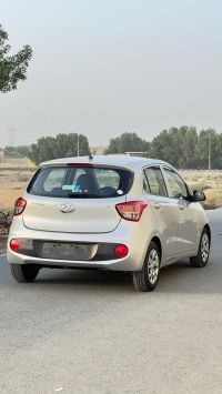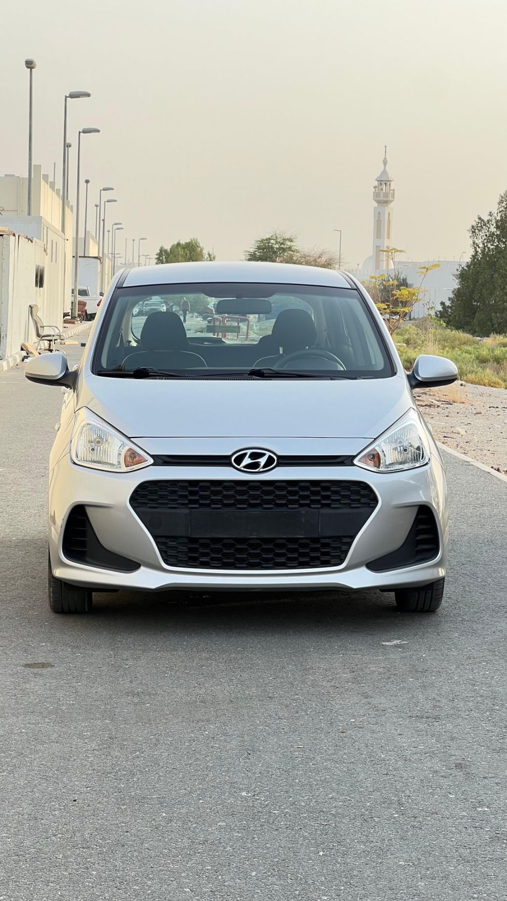Hyundai Grand i10 V4 with 2.1L capacity, model 2019. Price 23,000 dirhams. Odometer 82,000 km. Specifications: GCC specs. Silver exterior with beige interior. Technical specifications: 1.2L engine, 4 cylinders, multi-point fuel injection (MPI), maximum power 83 HP (61 kW) at 6000 RPM, torque 11.6 kgm at 4000 RPM, 5-speed manual transmission, front-wheel drive, acceleration (0-100 km/h).