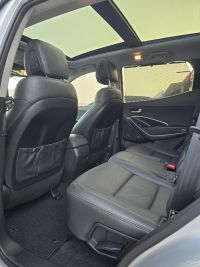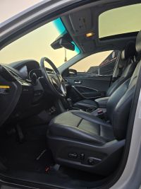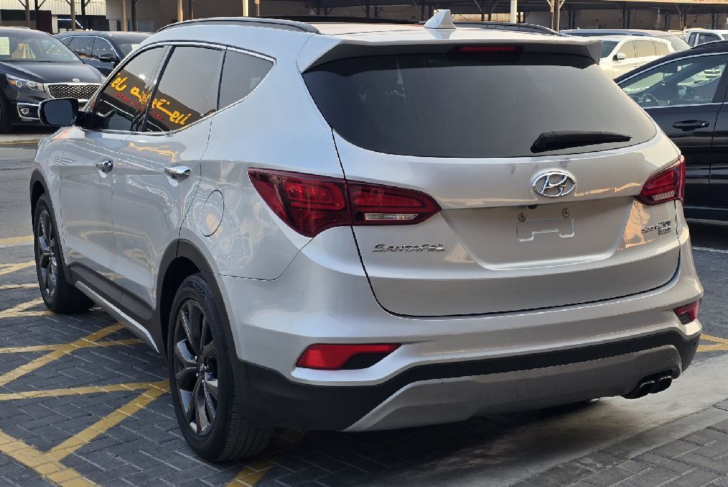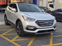 Hyundai Santa Fe American import, model 2017, mileage 76,000 miles, 2.0 Turbo engine. Features include keyless entry, push-button start, blind spot monitoring, cruise control, adaptive cruise control, interactive radar, rear air conditioning, power seats, leather seats, 360-degree cameras, rear sensors, front sensors, panoramic sunroof. Price: 38,500 AED.